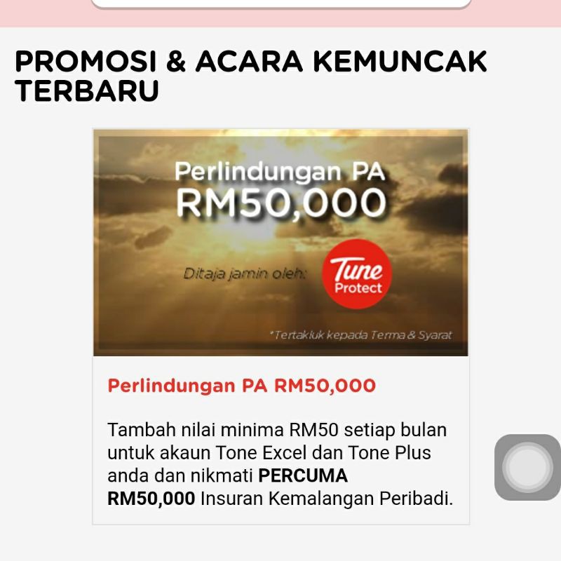 . Tambah nilai minima RM50 setiap bulan untuk akaun Tone Excel dan Tone Plus anda dan nikmati PERCUMA RM50000 Insuran Kemalangan Peribadi. Perlindungan PA RM50000. Saya menerima satu berita baik yang dinantikan selama ini iaitu perlindungan etiqa takaful bernilai RM50000 untuk semua pengguna simkad tone excel.